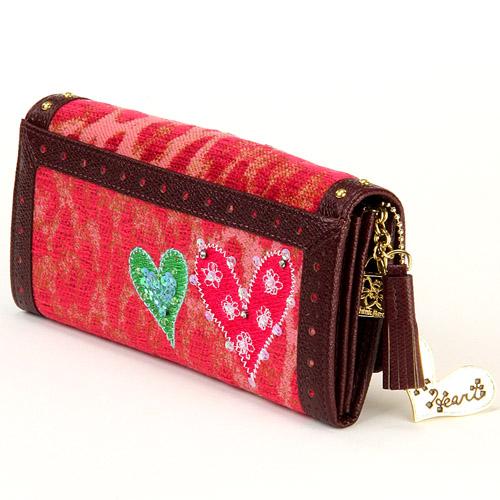 前面、背面それぞれに色とりどりのミシン刺繍をハート型に施し、ビーズ、スパンコール、スワロフスキーをポップな感覚であしらっています。